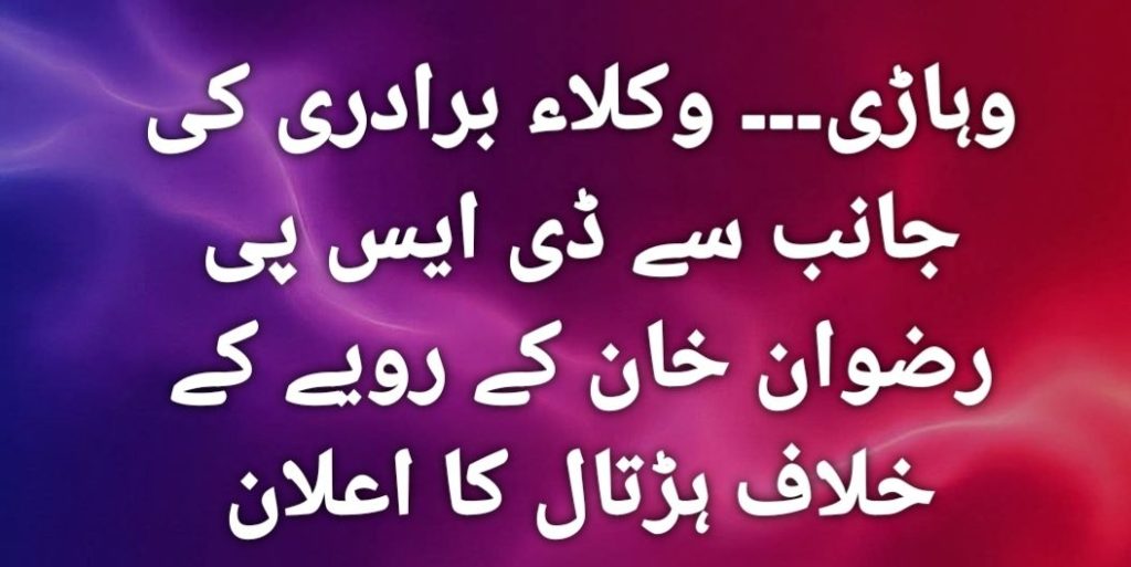 Latest Newsوکلاء برادری کی جانب سے ہڑتال۔۔۔ 27.10.2025 - by Nazeer Lashari - Leave a Comment وہاڑی پولیس کیخلاف وکلا برادری کا بڑا اعلان ڈسٹرکٹ بار ایسوسی ایشن وہاڑی نے ڈی ایس پی رضوان خان کے غیر ذمہ دارانہ رویے کے خلاف 28 اکتوبر کو مکمل ہڑتال کا اعلان، عدالتوں میں پیشی سے بائیکاٹ اور پولیس کی بے ضابطگیوں پر سخت احتجاج کا فیصلہ۔ Share this: Click to share on Facebook (Opens in new window) Facebook Click to share on X (Opens in new window) X