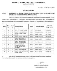 آرمڈ فورسز آفیسرز کے 10 افسران سی ایس ایس 2024 کے امتحان میں کامیاب ہوکر تعیناتی کی سفارش کر دی گئی جن میں 7 کیپٹن 2 لیفٹیننٹ ایک فلائٹ لیفٹننٹ کی تعیناتی کی سفارش کردی گئی جن میں سے 3 پولیس سروس پاکستان 2 فیڈرل سروس پاکستان جبکہ باقی 5 پاکستان ایڈمنسٹریشن سروس میں سیلیکشن کی گئی